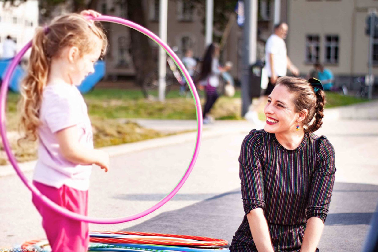 Inzwischen bewegt sie sich fließend zwischen der auftretenden und der vermittelnden Seite des Zirkus und freut sich über alle Interessierten denen sie begegnet.